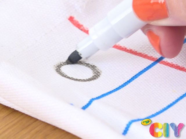 Use red fabric marker and ruler to connect the tick marks, making a vertical line to create the margin of a piece of notebook paper.