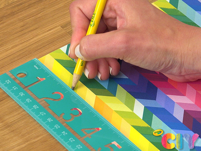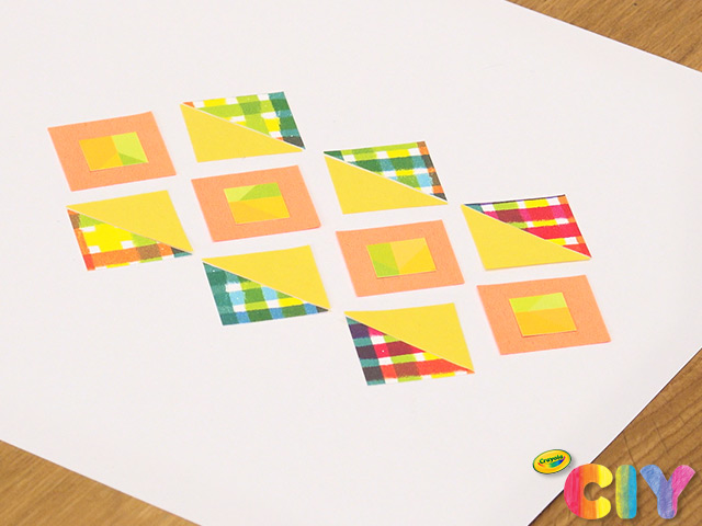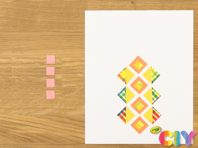 On left and right of middle squares, glue construction paper and Bright Pop cardstock triangles side by side to create diamond shapes.