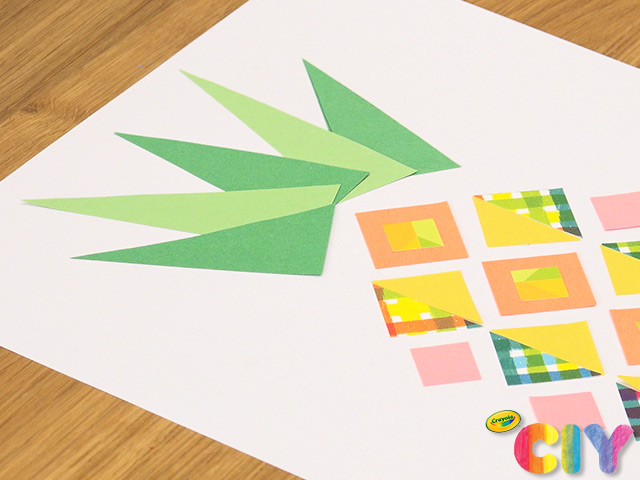 Glue 2 squares on the left and 2 squares on the right to complete pineapple fruit.