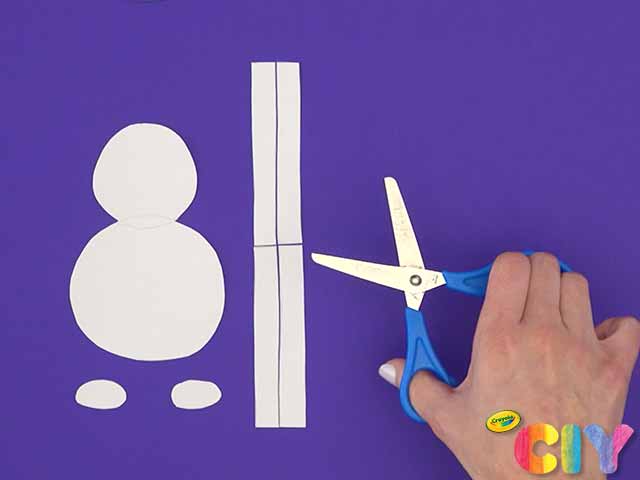 Sketch snowman body, feet, and 4 thin strips on white construction paper. Cut out.