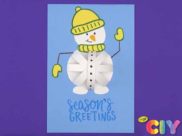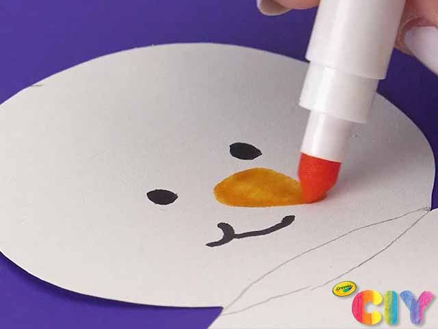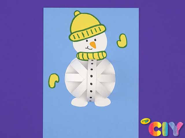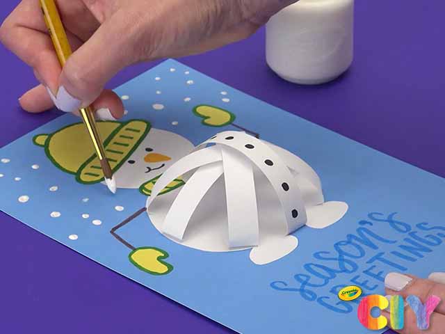 Add details to snowman face, hat, scarf, and mittens with markers. Add dots on thin paper strip to create buttons.