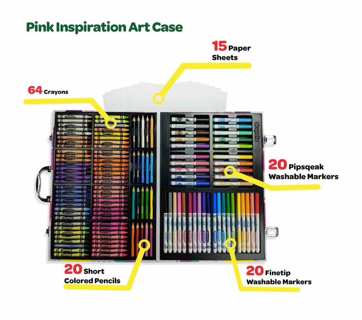 • COLORING SUPPLIES: Features 64 Crayons, 20 Short Colored Pencils, 20 Pip-Squeak Washable Markers, 20 Fine Tip Washable Markers, and 15 Large Sheets of Drawing Paper, all conveniently stored in a stunning graphic Travel Case.