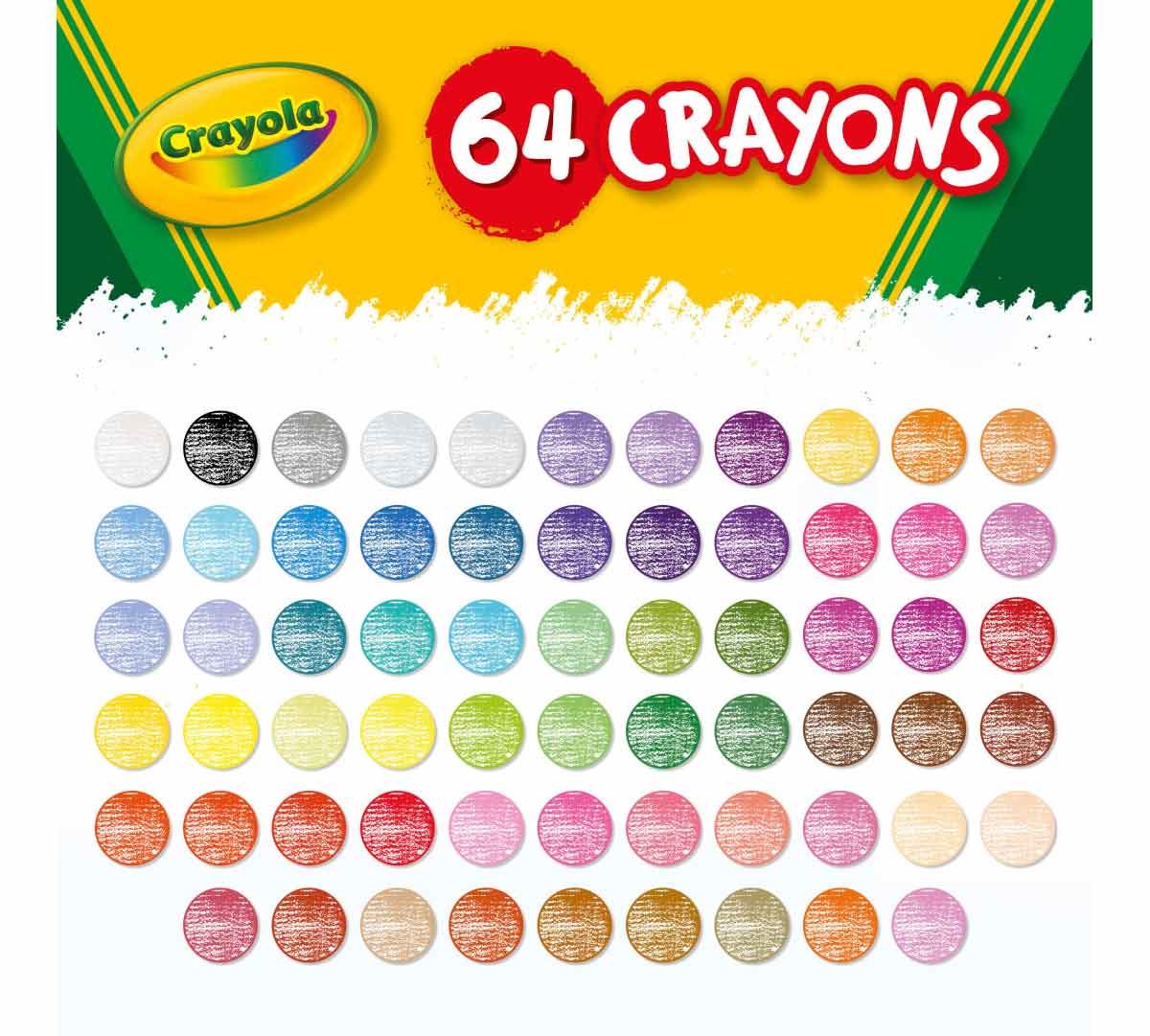 • Let your kids' imaginations run wild with Crayola Crayons in 64 Crayola colors. Each box of 64 Crayons has the traditional colors that you need plus new fab shades, as well as a built-in crayon sharpener for added convenience. Pair this set with a fun coloring book for a great bundled gift idea. The reusable crayon box is great for storage, and makes it easy for kids to keep their crayons organized. Keep it in backpacks for coloring projects at school. Use it for fun holiday crafts and everyday creative projects at home. There's no limit to the colorful possibilities!